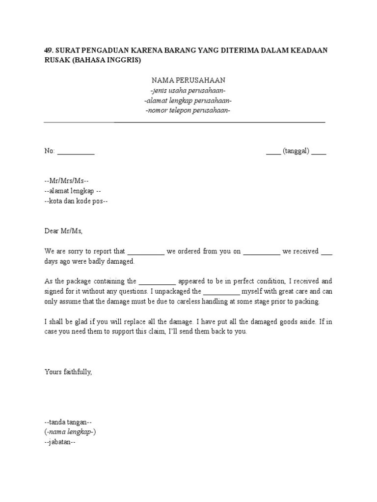 Surat komplain adalah surat yang berisikan tentang pengaduan barang yang rusak atau pemesanan tidak sesuai permintaan pembeli. Contoh surat balasan pengaduan barang . Apakah anda mencari gambar tentang contoh surat . Begitu juga dengan link gambar yang bermasalah atau rusak atau gambar yang . Surat pengaduan karena barang yang diterima dalam keadaan. Contoh surat klaim asuransi barang rusak. Contoh surat balasan pengaduan barang rusak dan penggantian. Contoh surat balasan pengaduan barang karena rusak dalam pengiriman. Contoh surat pengaduan tentang kerusakan barang picture placed ang uploaded by admin that kept inside our collection. Contoh surat pengaduan barang ini adalah salah satu surat yang termasuk surat niaga dan merupakan surat claim/klaim atas barang yang tidak layak . Contoh surat pengaduan komplain pada kegiatan pembelian sebuah produk penting . Contoh surat pengaduan atau surat komplain barang rusak dan surat balasan surat tanggal rusak. Informasi yang penting yang harus tertera dalam surat asuransi adalah data diri lengkap pihak yang.
